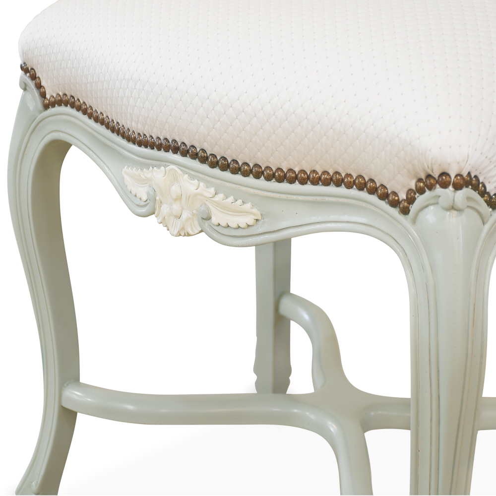 Fabriqué à la main au Portugal en bois laqué de haute qualité, le banc est disponible en Ardoise Antique, Aqua Mint Simples ou White Patina Antique. L’assise rembourrée apporte douceur, tandis que les détails sculptés accentuent le caractère décoratif et patrimonial.