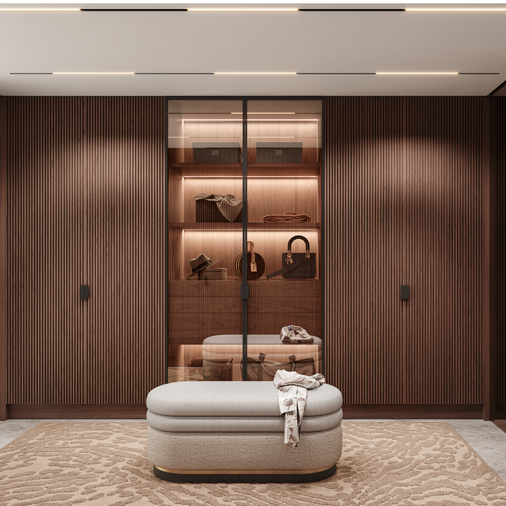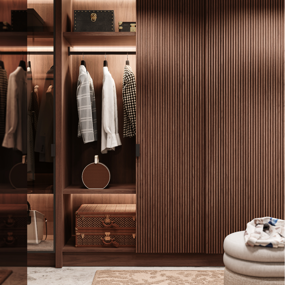 With the Devon Walk-In Closet, you can personalize every aspect. Adjustable shelving, hanging rods, soft-close drawers, and integrated LED lighting provide a smart and flexible system. These features keep your wardrobe neat, accessible, and beautifully illuminated. You can choose from elegant finishes like walnut veneer or white lacquer to complement any home décor style.